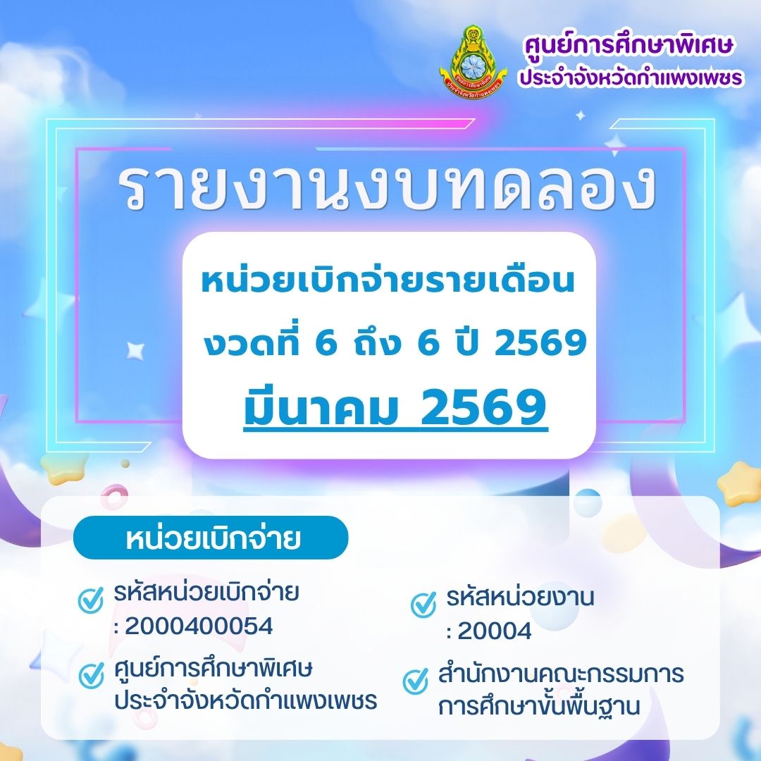 รายงานงบทดลองหน่วยเบิกจ่ายรายเดือน ศูนย์การศึกษาพิเศษ ประจำจังหวัดกำแพงเพชร ประจำงวด 12 ถึง 12 ปี 2568 27 ต.ค. 68
